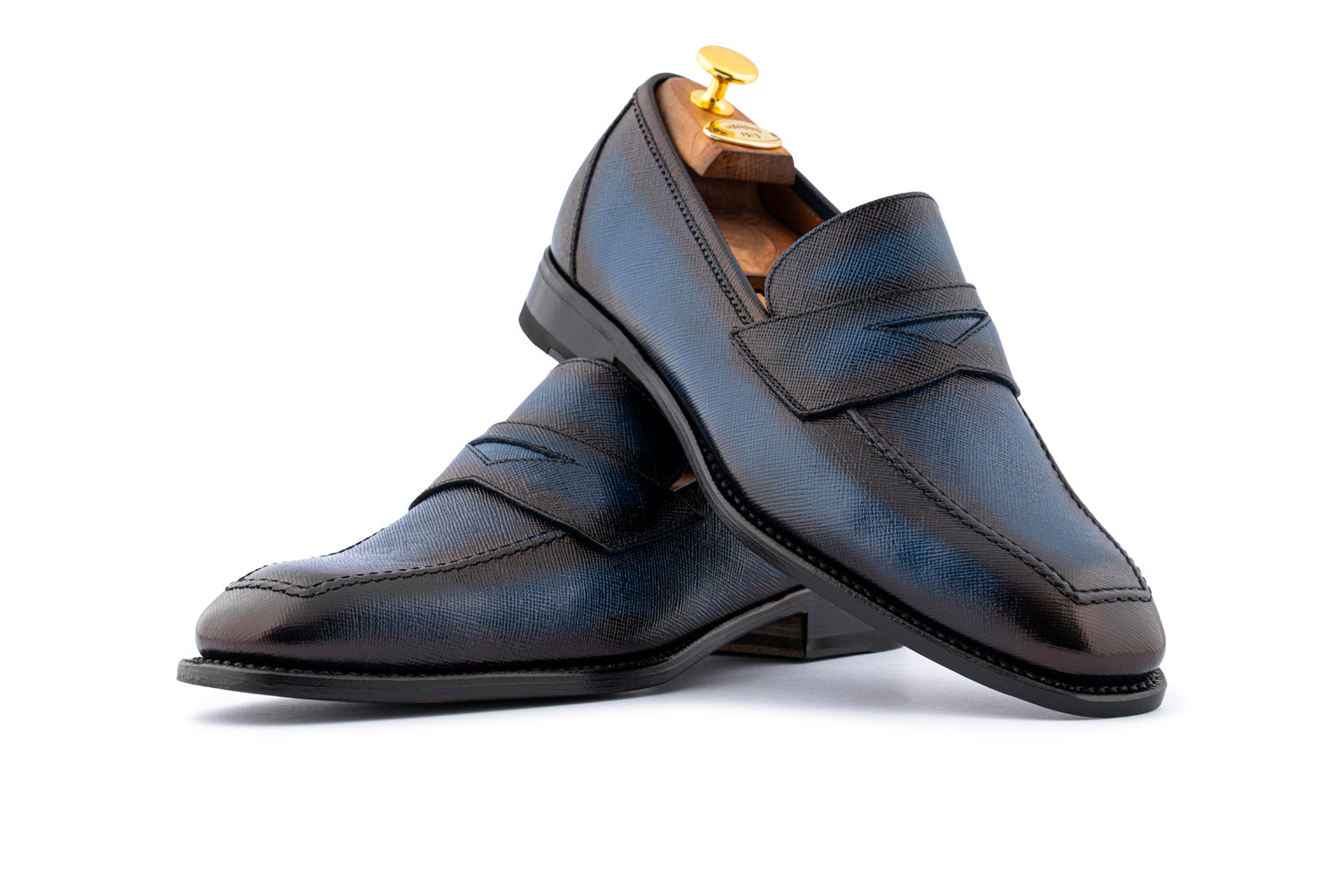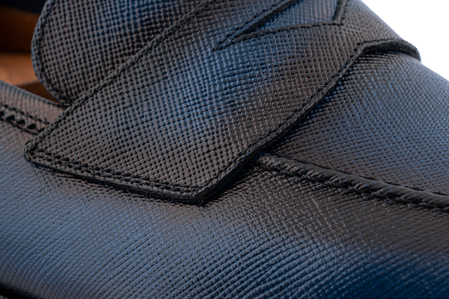 Pelle di vitello pieno fiore con stampa Saffiano, sinonimo di resistenza e stile. Le sfumature manuali e il passante coordinato si poggiano su una suola in cuoio con inserto in gomma, assemblata con metodo Blake Rapid.