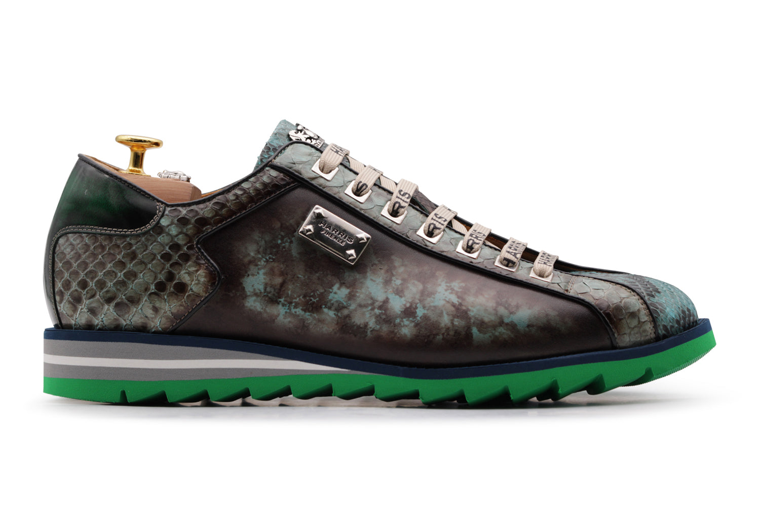 Realizzata in pelle di vitello stampata effetto coccodrillo, questa sneaker Harris esprime un carattere deciso ed esclusivo. I dettagli in suede laterali, uniti alla punta e linguetta rifinite con tocchi argento, arricchiscono la tomaia con contrasti sofisticati. Il tallone in pelle di pitone con finitura argento dona carattere mentre gli accessori Harris in nickel e la suola in gomma runner completano la calzatura con comfort ed eleganza.