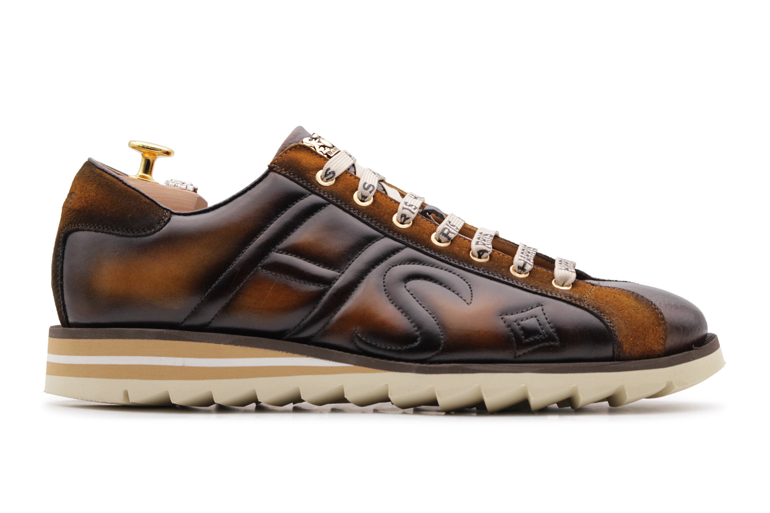 Harris Sneaker besteht aus vollem Kalbsleder, das von Hand malt und schattiert ist, und drückt italienische Kunsthandwerker aus. Das seitlich gestickte HS -Logo macht es sofort erkennbar, während der Krokodileffekt gedruckte Lederzunge und Wildlederdetails ein raffiniertes Kontrastspiel erzeugen.