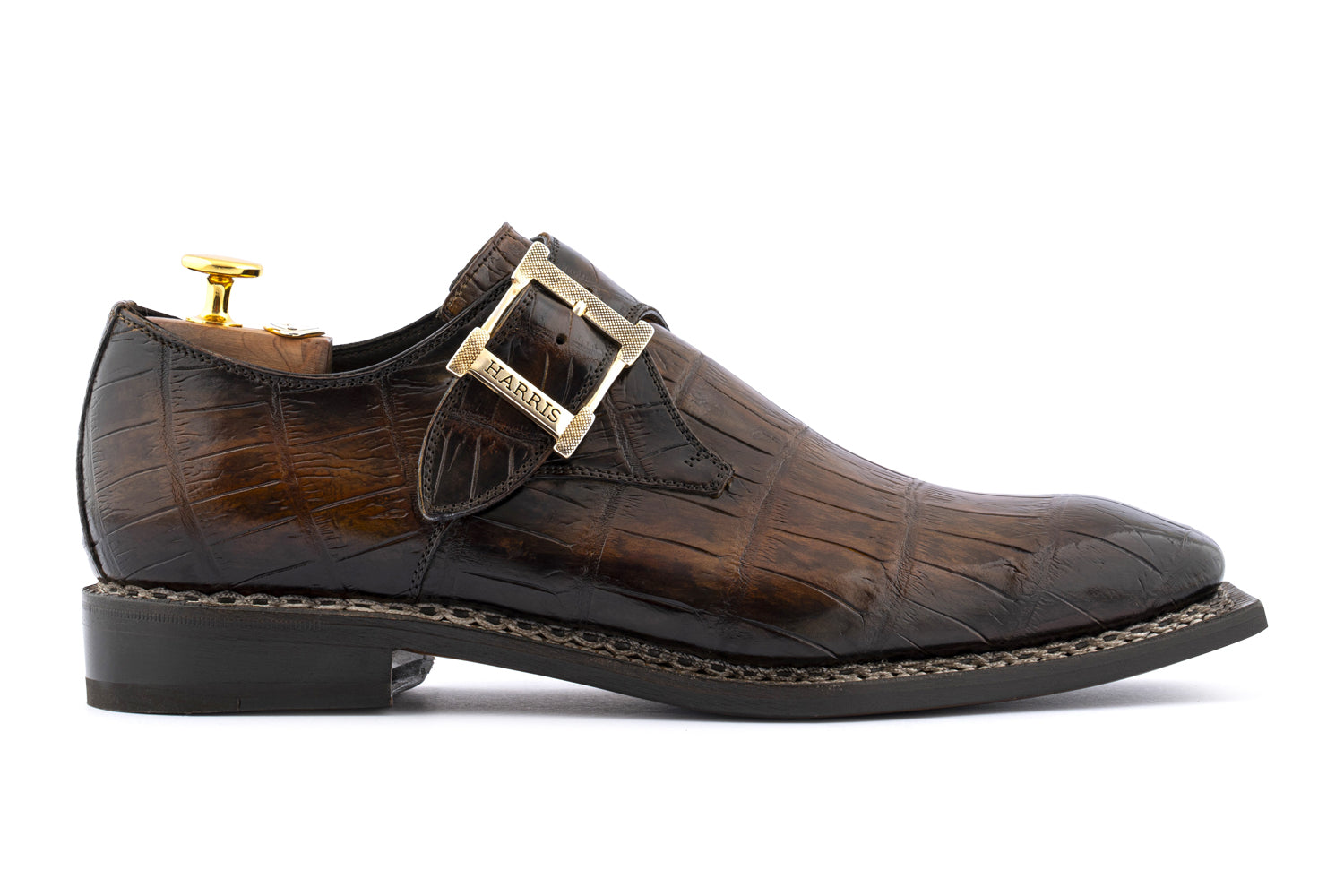 Elegante monofibbia realizzata in pelle di vero coccodrillo, dipinta a mano in una raffinata tonalità blu scuro sfumato nero. I dettagli valorizzano l’artigianalità del prodotto, frutto di una lavorazione norvegese di pregio che unisce tradizione e stile contemporaneo. Completa la calzatura una suola in cuoio che garantisce comfort, durata e un’eleganza senza tempo.