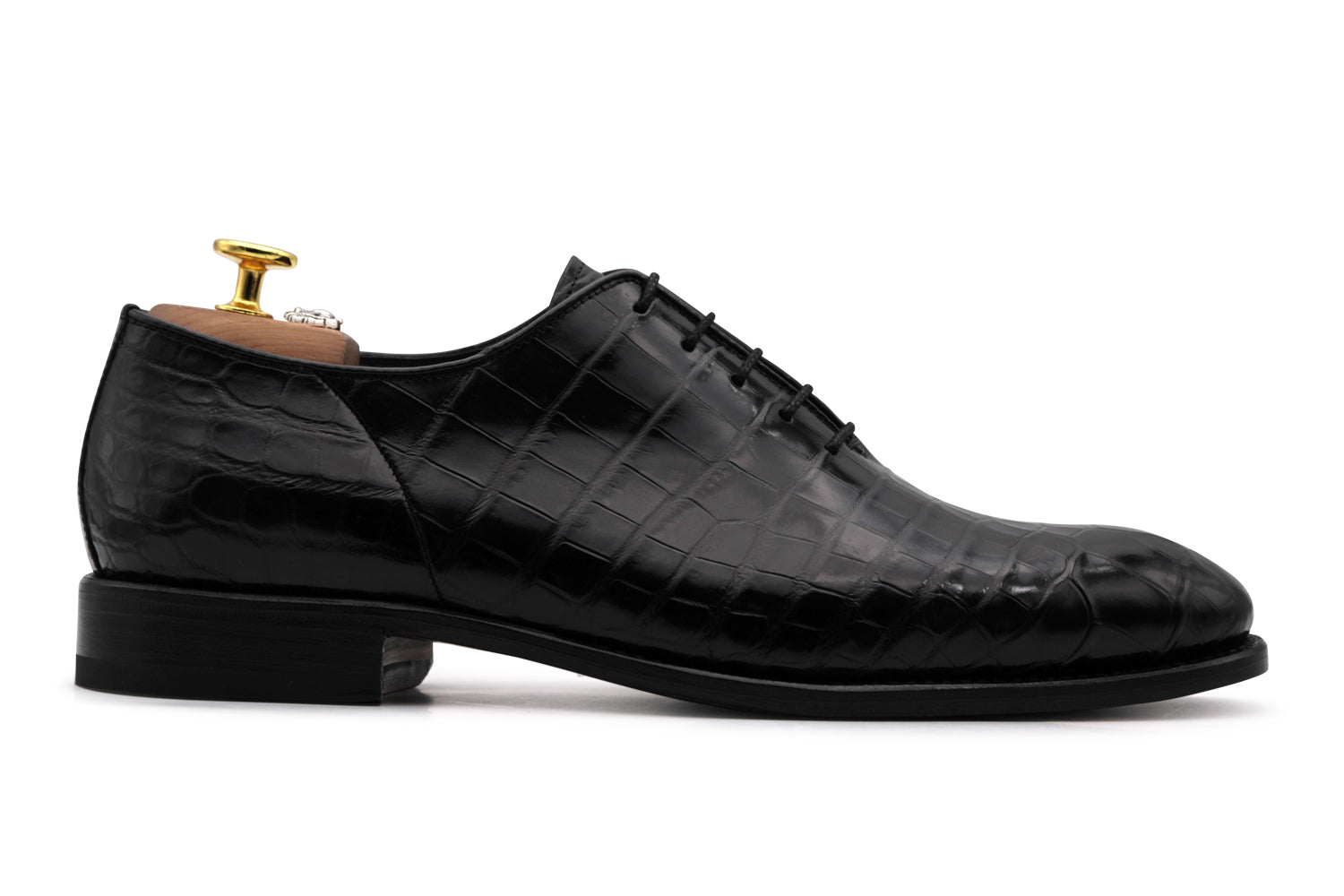 Francesina in pelle di vero coccodrillo color marrone dipinta a mano con dettagli scuri. La lavorazione Blake Rapid e la suola in cuoio con inserti in gomma antiscivolo conferiscono eleganza, stabilità e una tenuta impeccabile.