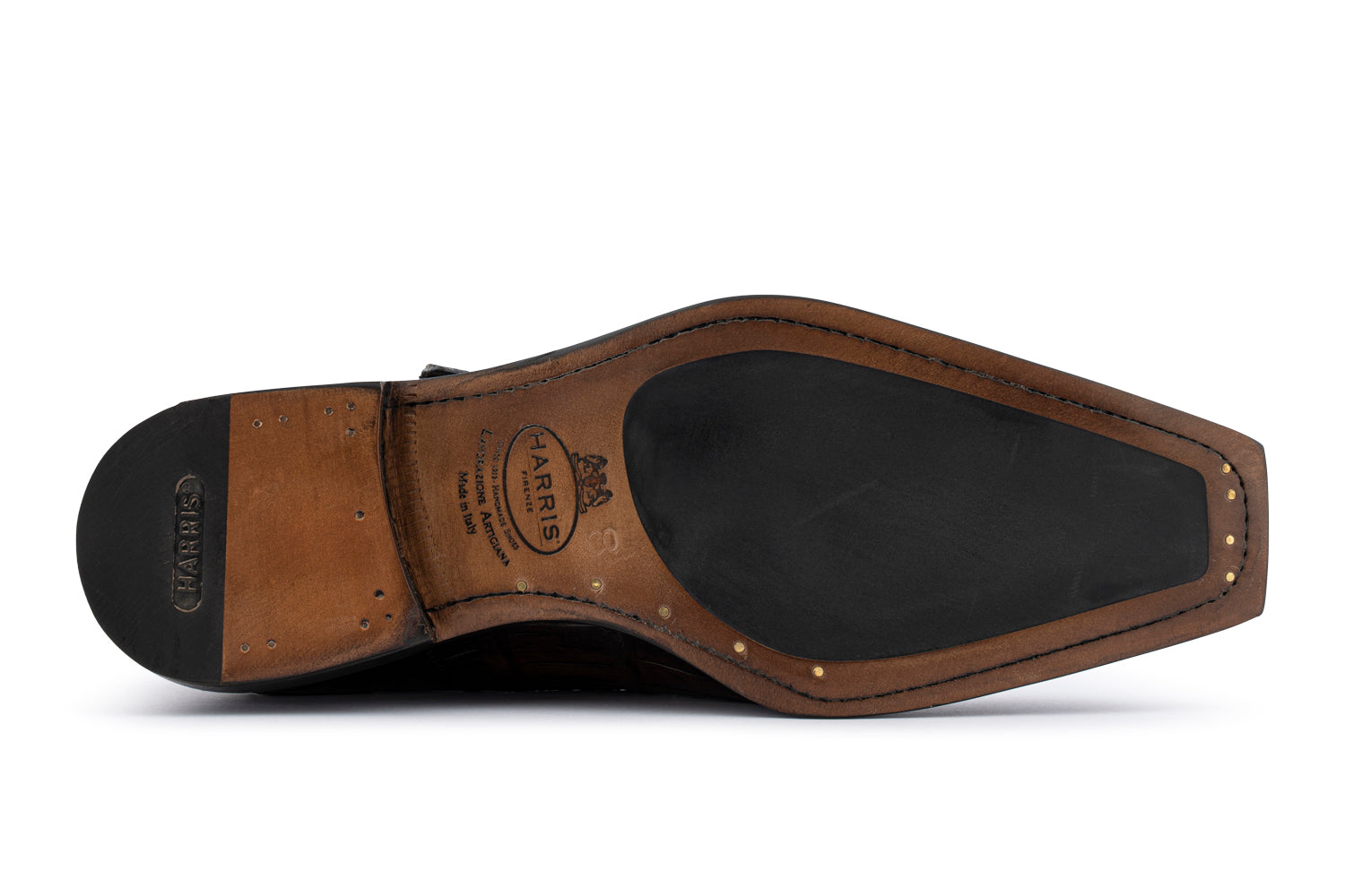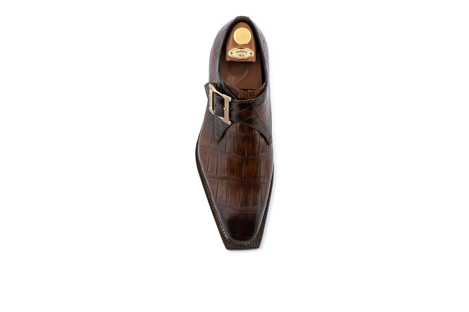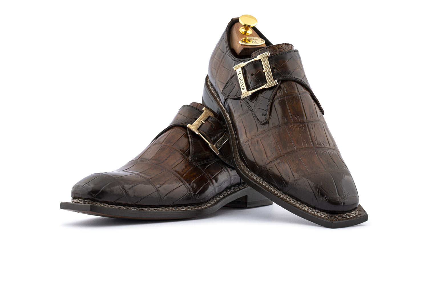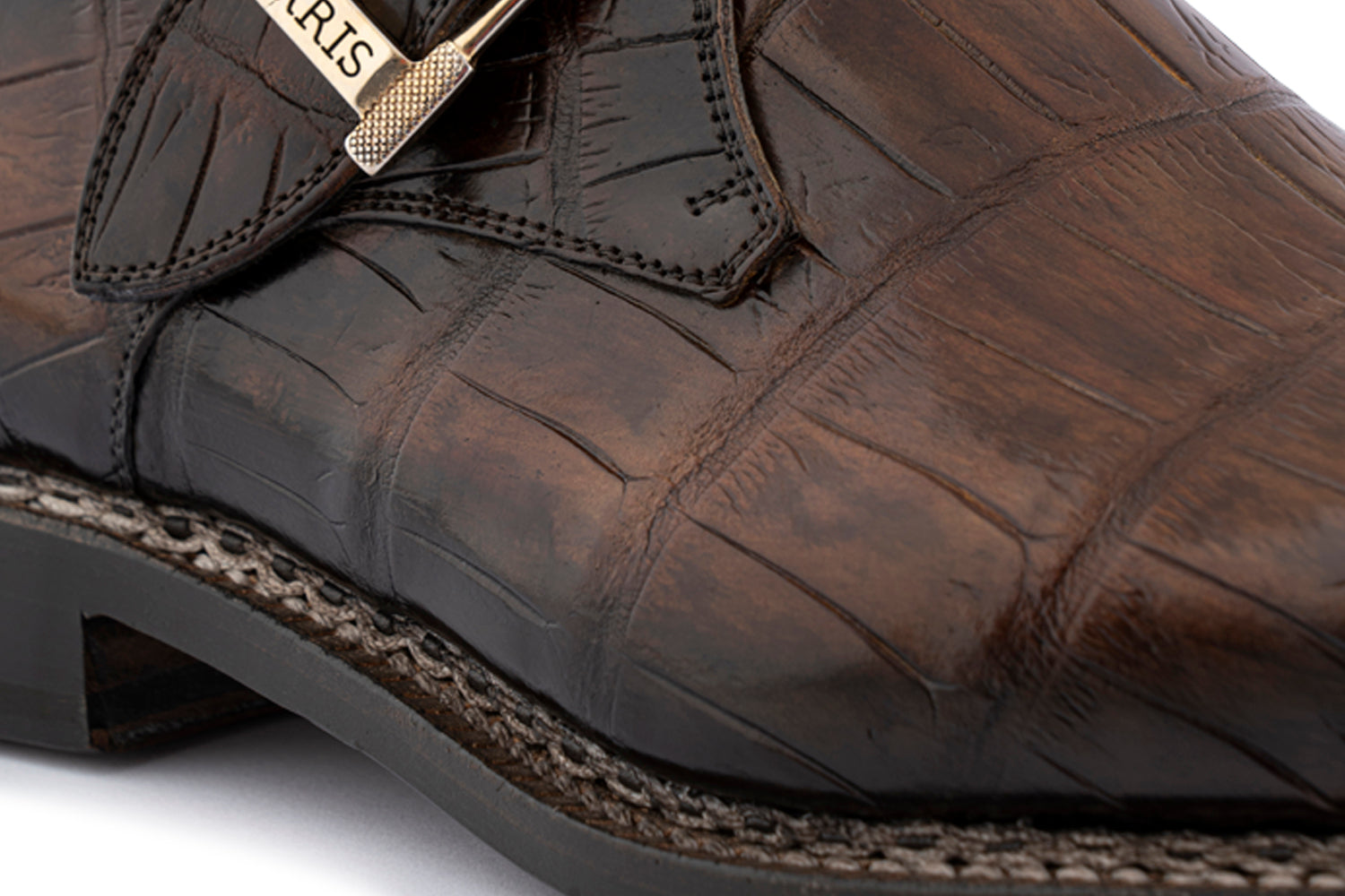 Raffinata monofibbia in pelle di vero coccodrillo, dipinta a mano in una calda tonalità marrone scuro con riflessi profondi. Le sfumature manuali valorizzano la texture naturale della pelle e l’eccellenza artigianale della lavorazione norvegese. Completa il modello una suola in cuoio, sinonimo di eleganza e tradizione.