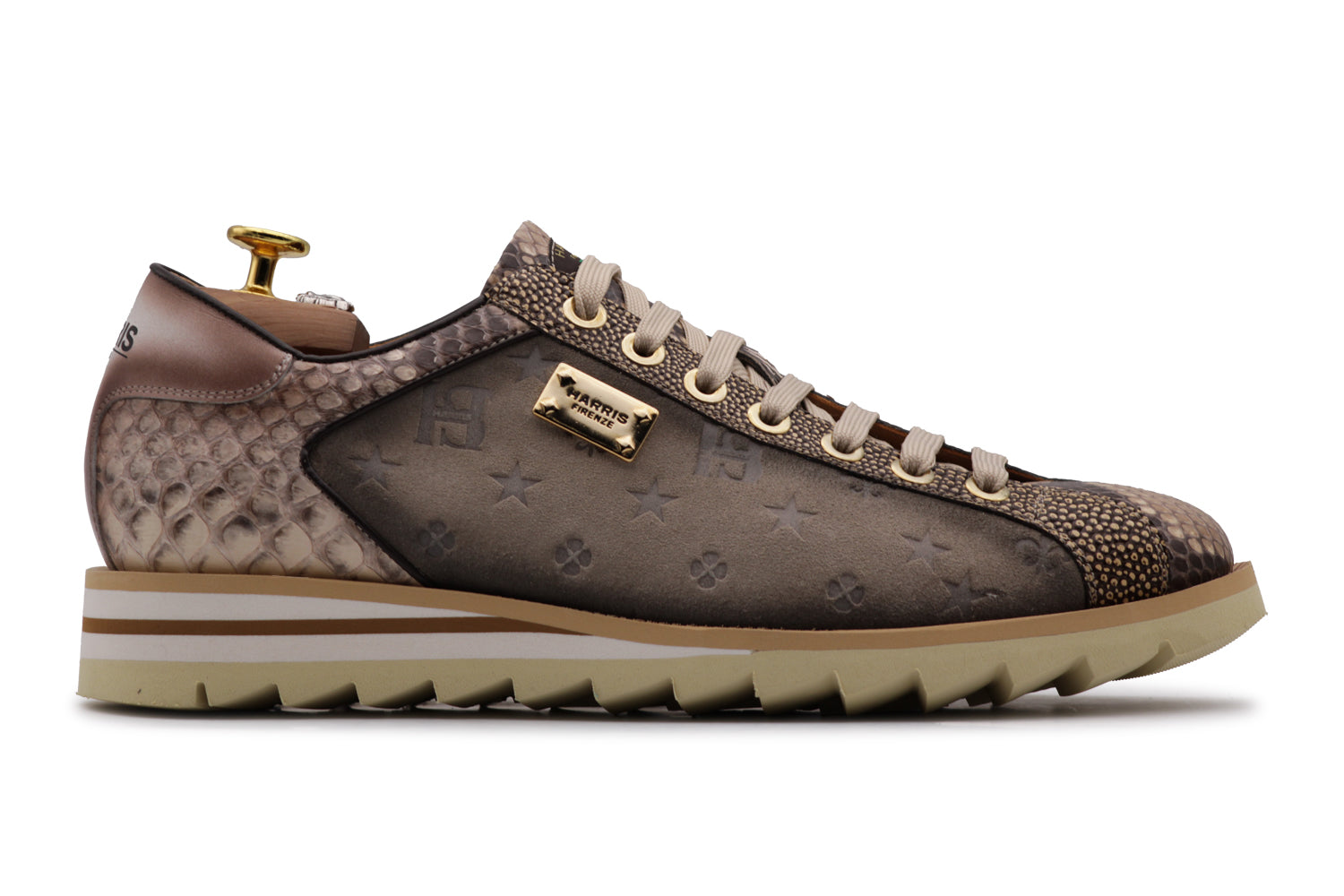 El monograma de Harris sobre una base de ante de color. Testa di Moro combina bien con el refinamiento del pitón color crema en la lengüeta y el talón. Un toque de ante rojo matizado en la parte trasera ilumina el zapato, sellado por accesorios dorados.