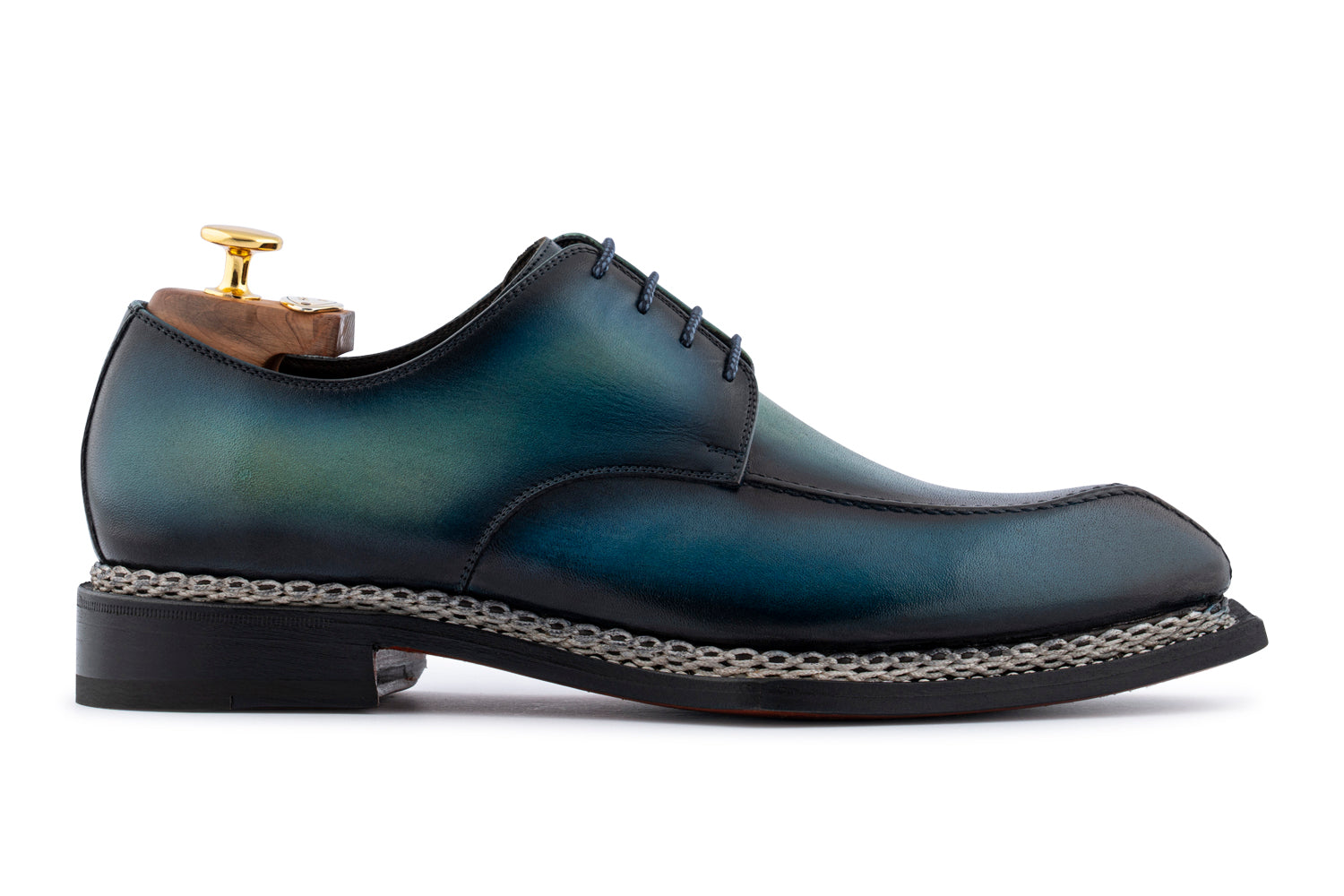 Derby in pelle di vitello pieno fiore, interamente dipinta a mano per un effetto raffinato e unico. L’allacciatura derby ne sottolinea lo stile versatile, mentre la lavorazione norvegese assicura robustezza e lunga durata. Completa il modello la suola in cuoio che unisce eleganza e tradizione.