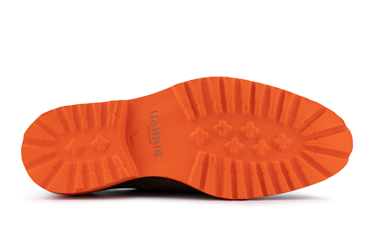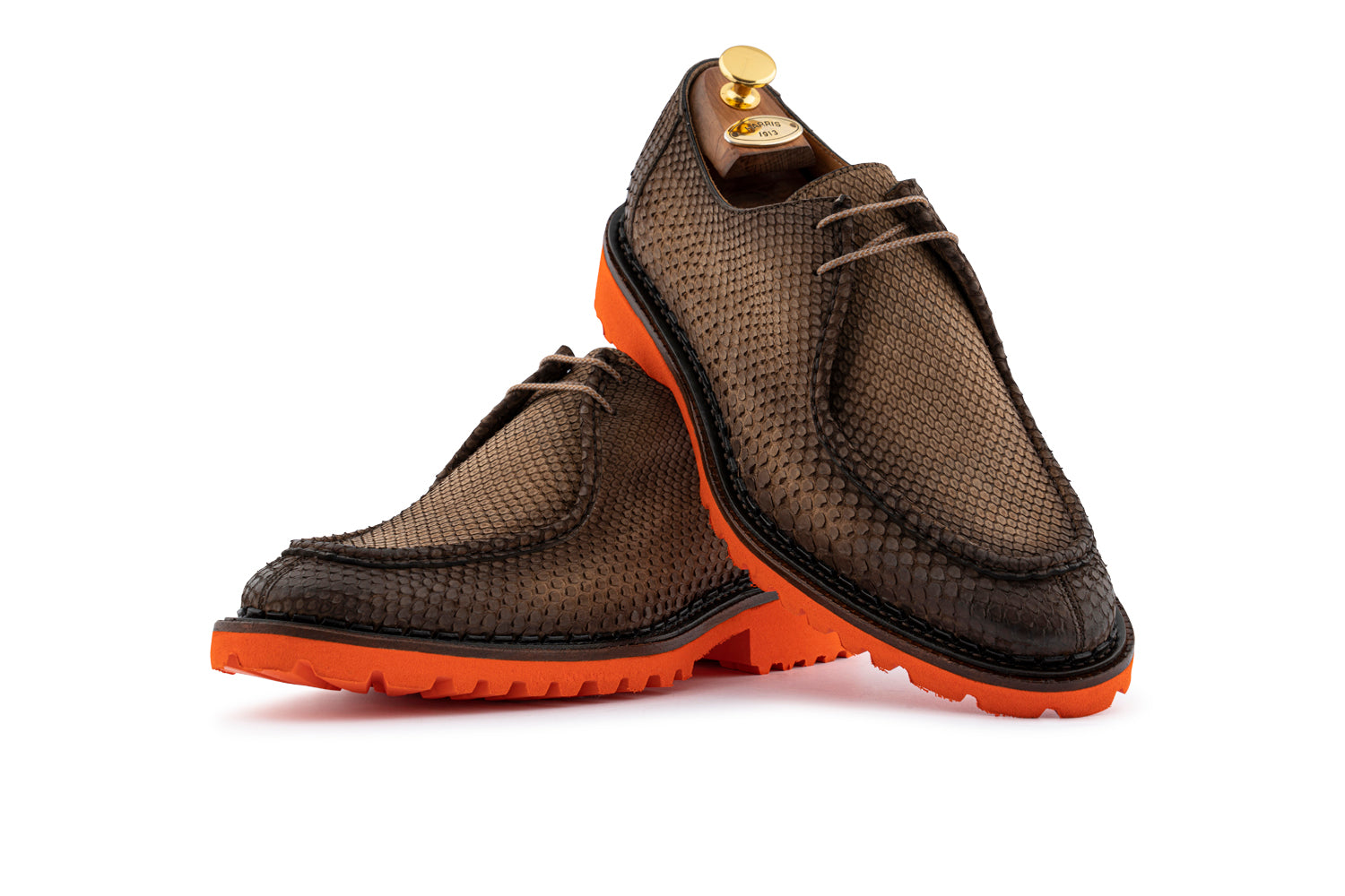 Un modello che unisce lusso e personalità. Realizzata in pelle di vero pitone marrone, è sfumata e cucita a mano, per un effetto unico e artigianale. La lavorazione Blake Rapid garantisce solidità e comfort, mentre la suola in gomma carrarmato color arancio dona carattere deciso e uno stile contemporaneo.
