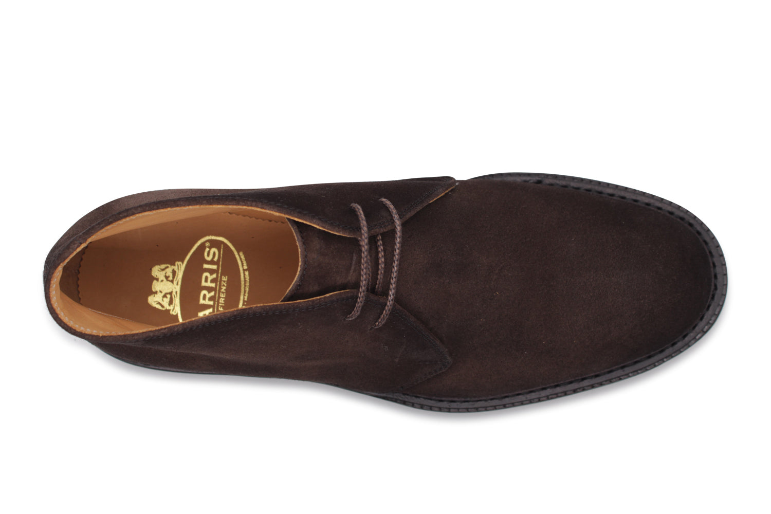 Cuir suédé noir avec trépointe cousue et semelle en caoutchouc Dainite, résultat de la fabrication traditionnelle Blake Rapid. Essentiel, polyvalent, contemporain : un modèle Harris qui allie sobriété et caractère.