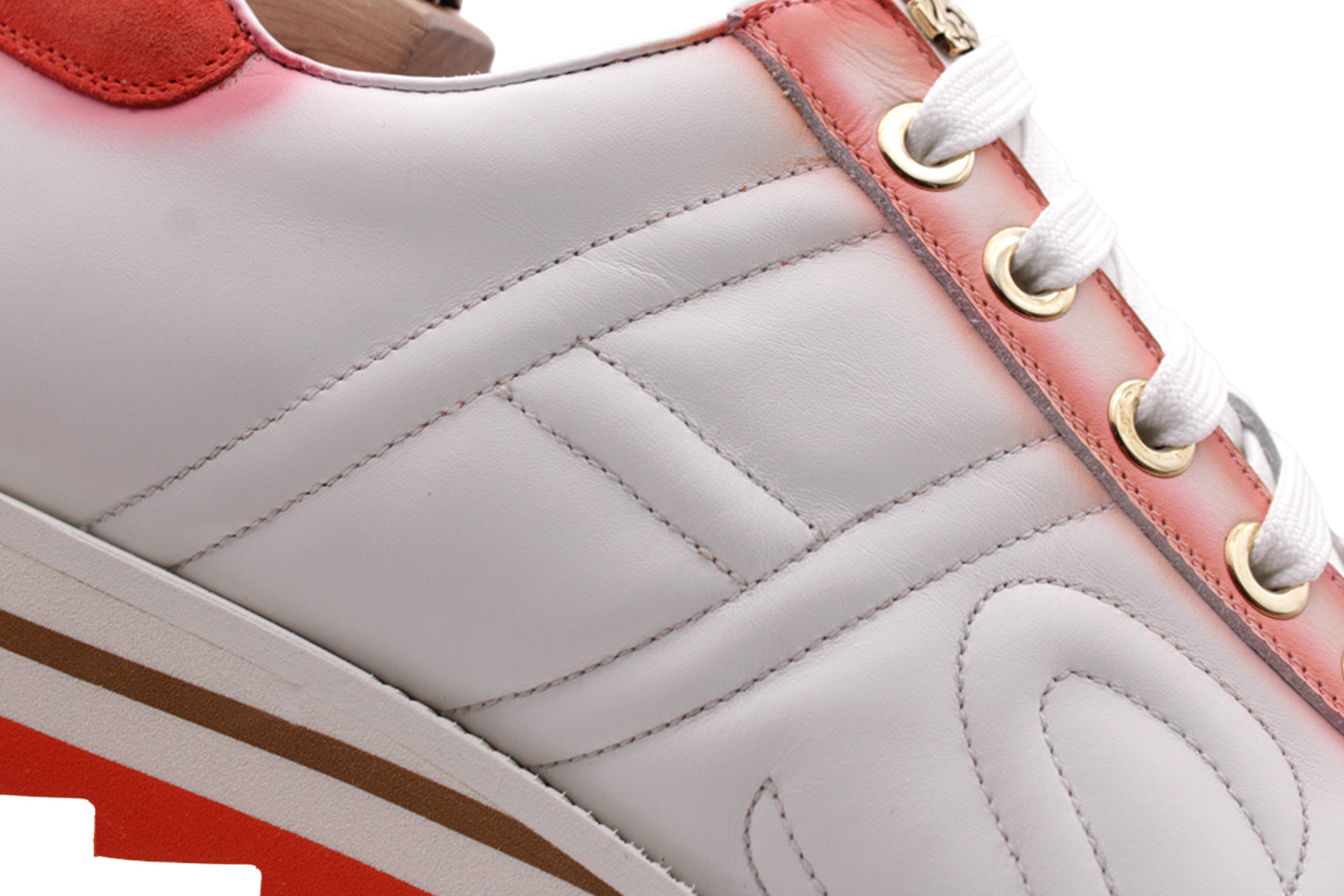 Sneaker en veau pleine fleur blanc, égayée de détails en daim nuancé orange. Le laçage tricoté main complète un look frais et estival.