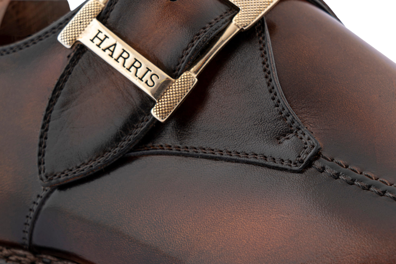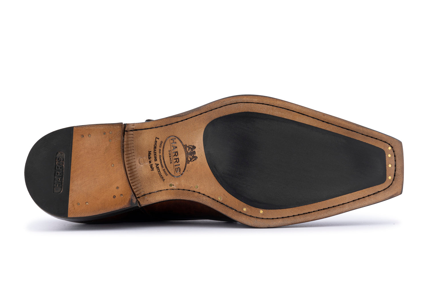 L'essenza di Harris Shoes si esprime in questa calzatura in vitello pieno fiore. La lavorazione Norvegese, visibile nelle tipiche cuciture trecciate, conferisce robustezza e un carattere distintivo. Ogni paio è dipinto a mano con sfumature scure per un look senza tempo.