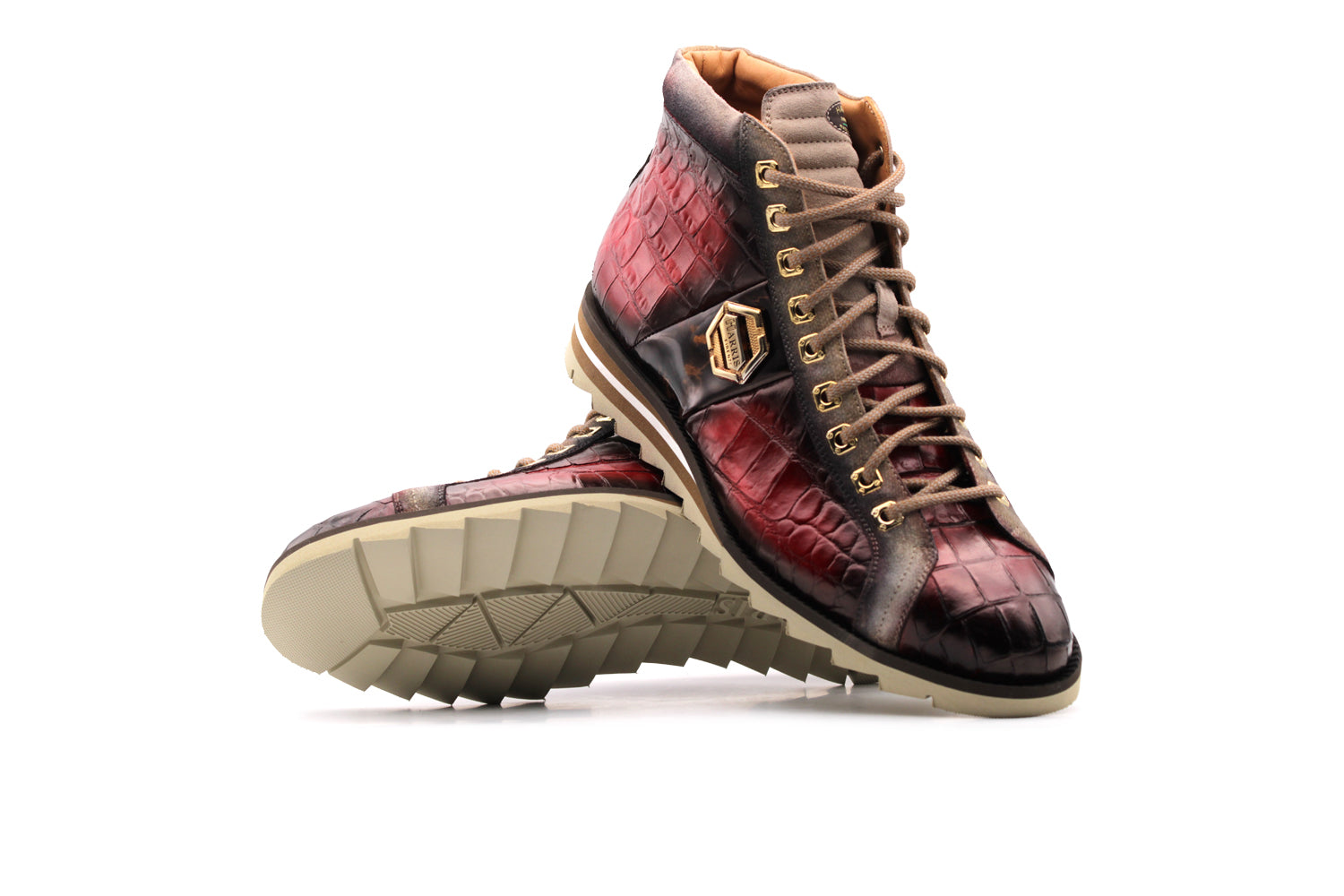 Profondità e texture si fondono in questa sneaker in vitello stampa coccodrillo color marrone bruciato, dipinta a mano per un effetto unico. I dettagli laterali testa di moro dialogano con la morbidezza della pelle scamosciata beige sfumata su tallone, linguetta e allacciatura. Accessori oro per un finish di classe.